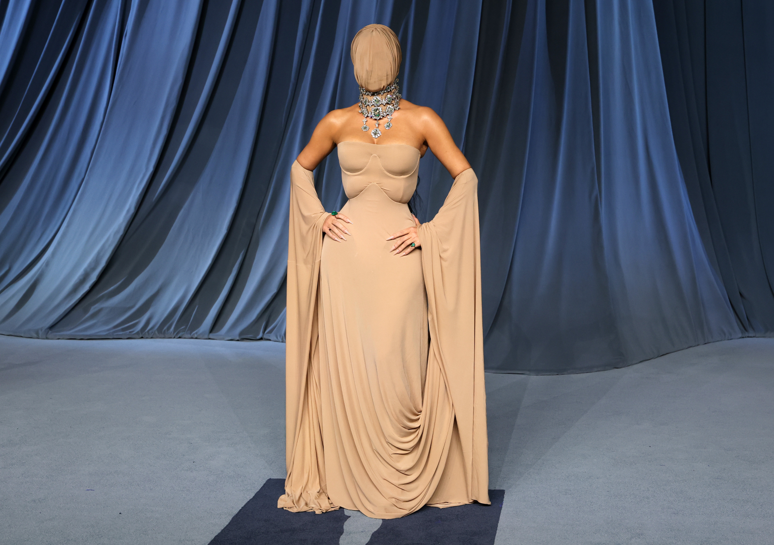 A vállalkozó és reality-sztár egy Maison Margiela estélyit viselt, mellrésznél fűzős, pánt nélküli fazonnal, a szoknya aljához kapcsolt leomló, köpenyszerű ujjakkal, a look kulcseleme pedig egy nude árnyalatú, az arcot teljesen eltakaró maszk volt. Az ékszereket visszafogottan, mégis hatásosan választotta: többsoros gyémántnyaklánc csillant a nyakán.