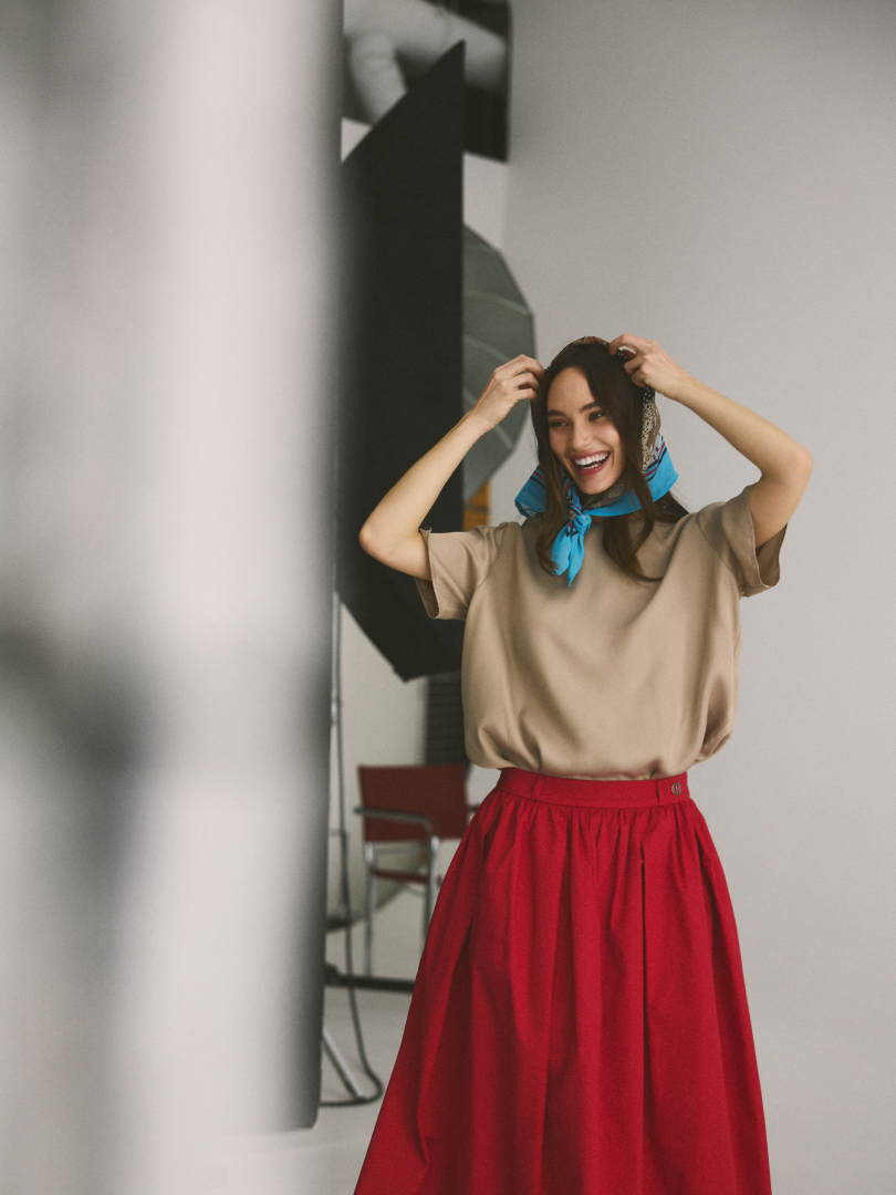 A kollekció a nőies eleganciára épül, amely egyaránt megfelel az irodai dress code-nak, a munka utáni hétköznapi, városi viseleteknek, sőt még a nyaralás során magunkra öltött elegánsabb daraboknak is. A színpaletta világos, hűvös szürke, fehér és bézs színeket tartalmaz, kiegészítve erős türkiz és piros árnyalatokkal. Ezek a színek megjelennek egy patchwork mintás maxi ruhán, egy lendületes piros szoknyán (amelyet Meryl Streep Met-gálás megjelenése ihletett, letisztultabb, hétköznapibb változatban, szintén piros szatén toppal párosítva), valamint a kollekciót kiegészítő selyemkendőn is.