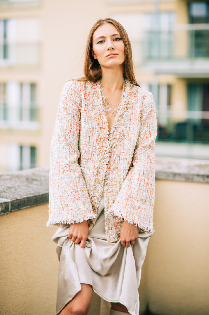 A karakteres tweed és a fényes selyem együtt tökéletes egyensúlyt alkot. Egy tweed blézer egy lágy tónusú selyemruhával rendkívül nőies megjelenést kölcsönöz a viselőjének, de a look mégsem kelt túl sznob hatást. Ha elegáns esti szettet szeretnél belőle alkotni, akkor párosítsd bőr bokacsizmával, meglátod a végeredmény egyszerűen nagyszerű lesz.