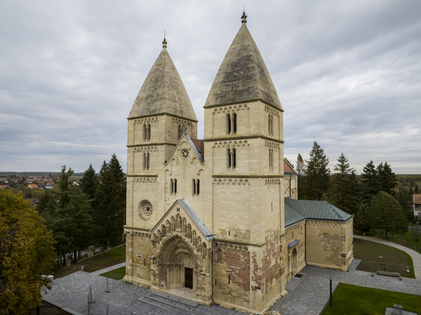 A templom egyik legjellegzetesebb eleme a két vaskos, monumentális torony, amely akár tíz kilométerről is látható. Bélletes főkapuja kétségkívül Magyarország egyik legszebben díszített román kori templomkapuja, a stílus igazi iskolapéldája. A bejáratot két kőoroszlán őrzi – ezek már másolatok, mivel az eredeti szobrok elpusztultak. A kapu felett lépcsőzetesen helyezkedik el Krisztus és a 12 apostol életnagyságú szoborcsoportja. A szemet a geometriai mintákkal díszített kapubélletek vezetik a kapuhoz, majd a timpanonban angyalok között trónoló Krisztus alakjához. A kapu két oldalán, a fülkékben a gyermekét tartó Madonna és az oroszlánnal küzdő Sámson szobrai láthatóak.