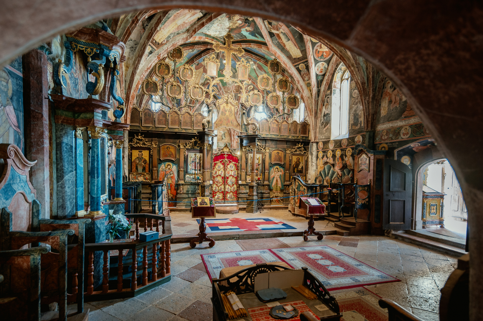Az ortodox liturgia sajátosságai itt is megfigyelhetők: padsorok helyett csupán néhány támaszkodószék szolgálja a híveket, a hajótér pedig árkádos válaszfallal különül el. A szentély közelében látható Madonna-ikon különösen figyelemre méltó; rajta apró fémmedálok lógnak, a hívek hálájának jelképeként, a csodaként megélt gyógyulásokért.