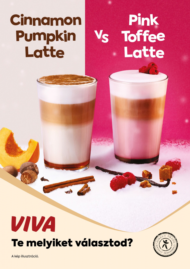 A VIVA idei téli újdonságai, a Cinnamon Pumpkin Latte és a Blushed Toffee Latte minden kortyukkal egy kis ünnepet varázsolnak a rohanó hétköznapokba. A Cinnamon Pumpkin a klasszikus télies ízek rajongóinak szól: selymesen krémes, lágyan fűszeres, és a fahéj ünnepi melegségét idézi meg. A Blushed Toffee Latte ezzel szemben a modern, játékos ízvilágot képviseli. A toffee karamelles édessége és a piros bogyós gyümölcsök frissessége különleges egyensúlyt teremt – tökéletes választás mindazoknak, akik szeretik, ha a kávé nemcsak melegít, de el is varázsol.