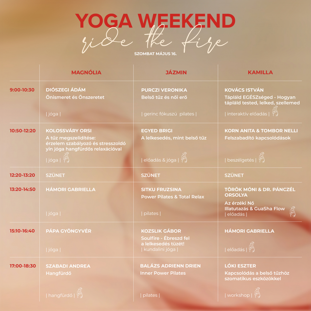 Két nap, amikor egésznapos jógaprogrammal készülünk Magyarország elismert oktatóinak és előadóinak segítségével. A moduláris órarend lehetővé teszi, hogy a saját ritmusodban haladj – legyen szó energikus flow-ról vagy elcsendesedő, befelé figyelő gyakorlásról.