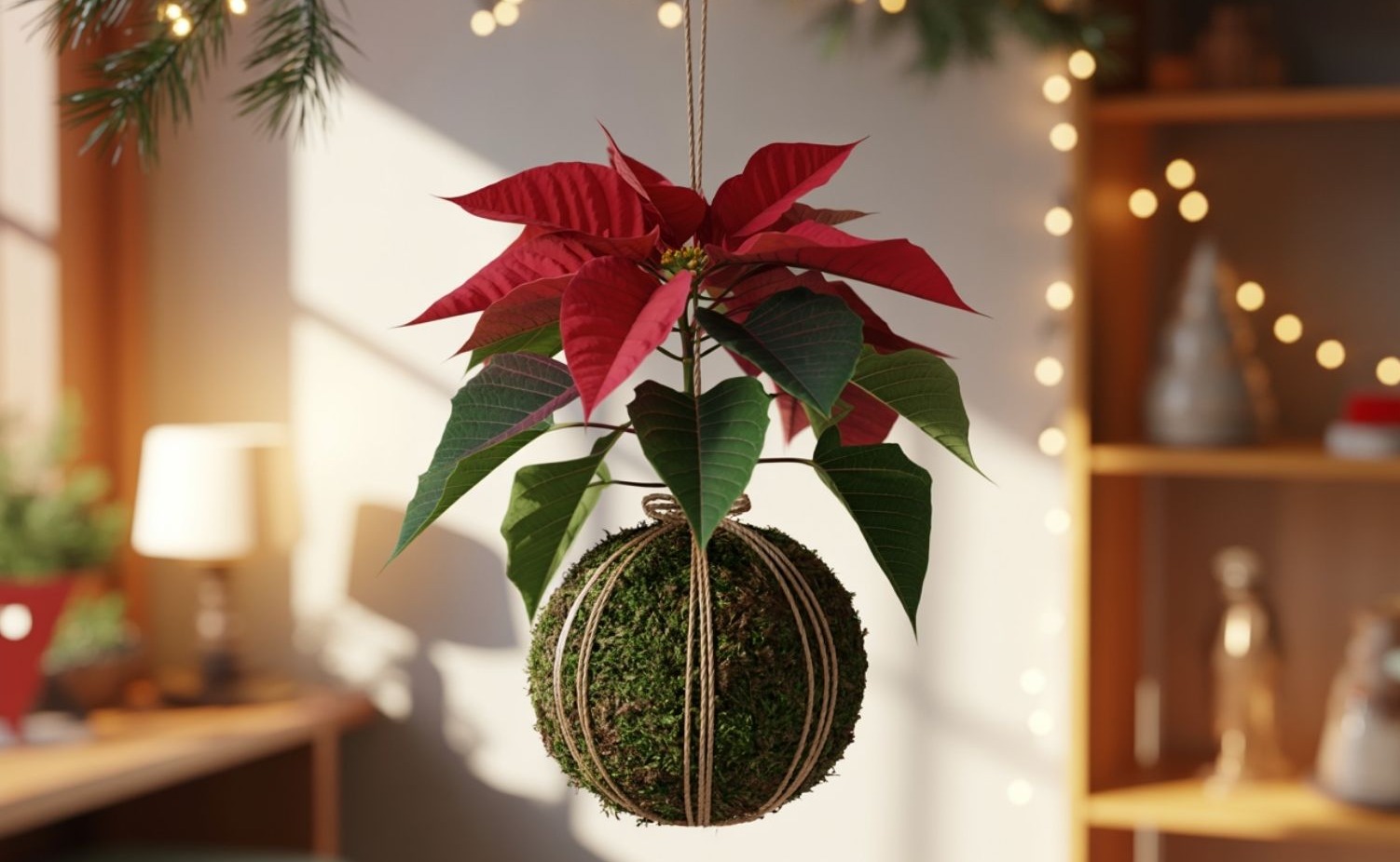 A mikulásvirág klasszikus karácsonyi dekor, de kokedamaként teljesen újjászületik. A piros fellevelek és a zöld moha kontrasztja mesés ünnepi hangulatot ad, miközben a növény sokkal modernebbnek és elegánsabbnak hat, mint a hagyományos cserepes változat.