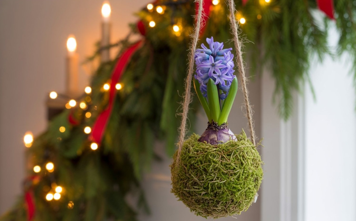 A jácint kokedama minimalista, elegáns és nagyon fotogén – igazi modern karácsonyi dekoráció.