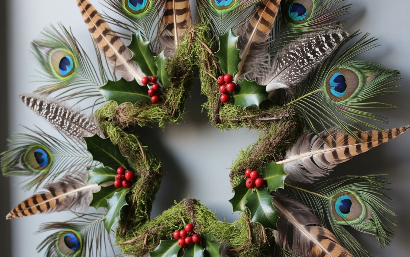 A magyal fényes levelei és piros bogyói mellé helyezett pávatollak, fürjtollak és barna csíkos tollak izgalmas, rétegezett textúrát hoznak létre. A tollak selymes felülete csodás kontrasztot ad a természetes zöldeknek – így a dekoráció egyszerre marad természetközeli és modern.