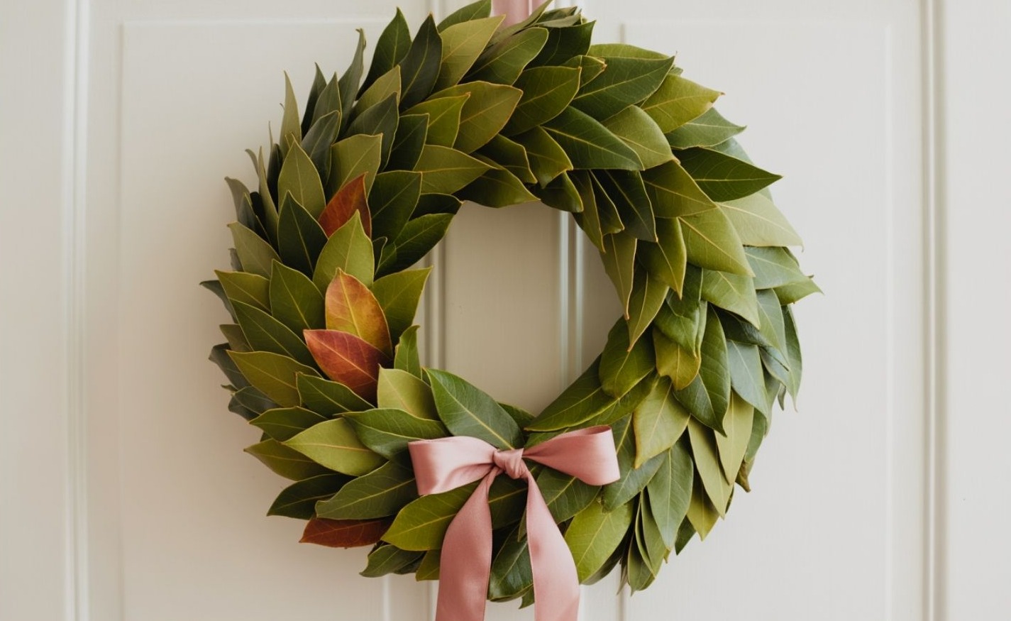 A babérlevélből készült füzér tökéletes választás, ha kedveled a természetes karácsonyi dekorációt és a minimalista eleganciát. A babér bőrös, fényes levelei és vöröses fonákja gyönyörű színátmenetet hoz létre, különösen, ha sűrűn egymásra rétegezve kerülnek a kör alakú alapra.