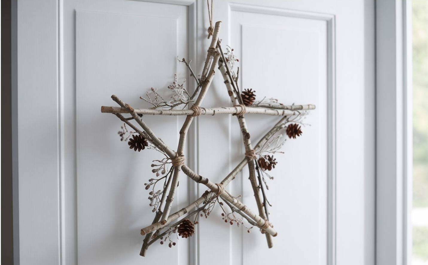A csillag alakú függődísz az egyik legjobb alternatíva a klasszikus karácsonyi koszorú helyett. A gallyakból ragasztott keret könnyedén elkészíthető, és gyönyörűen mutat skandináv, rusztikus vagy minimalista bejáratoknál is.