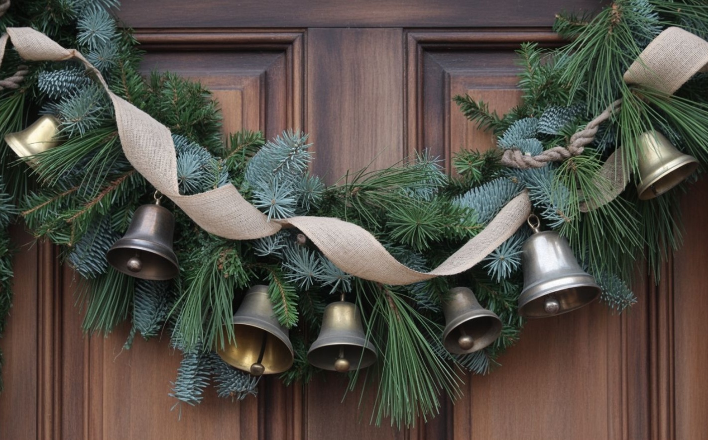 A fenyő és jegenyefenyő kombinálása különösen szép textúrát ad, a rafia és a természetes kötelek melegséget visznek a kompozícióba, a régi stílusú csengők pedig nosztalgikus karácsonyi hangulatot teremtenek.