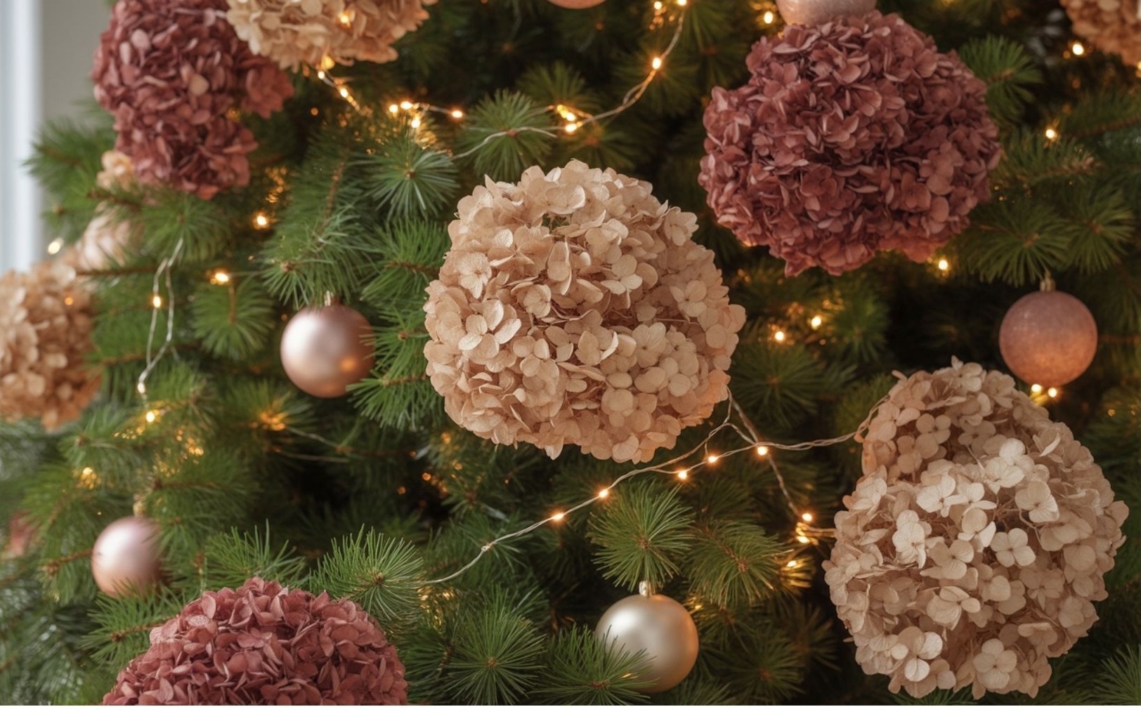 Különösen jól működik a szárított hortenzia. Természetes módon szárad, szépen tartja a formáját, és elegáns, kissé romantikus hangulatot kölcsönöz a karácsonyfának. Egy-egy ilyen ág elhelyezése azonnal szerkesztettséget ad a fának.