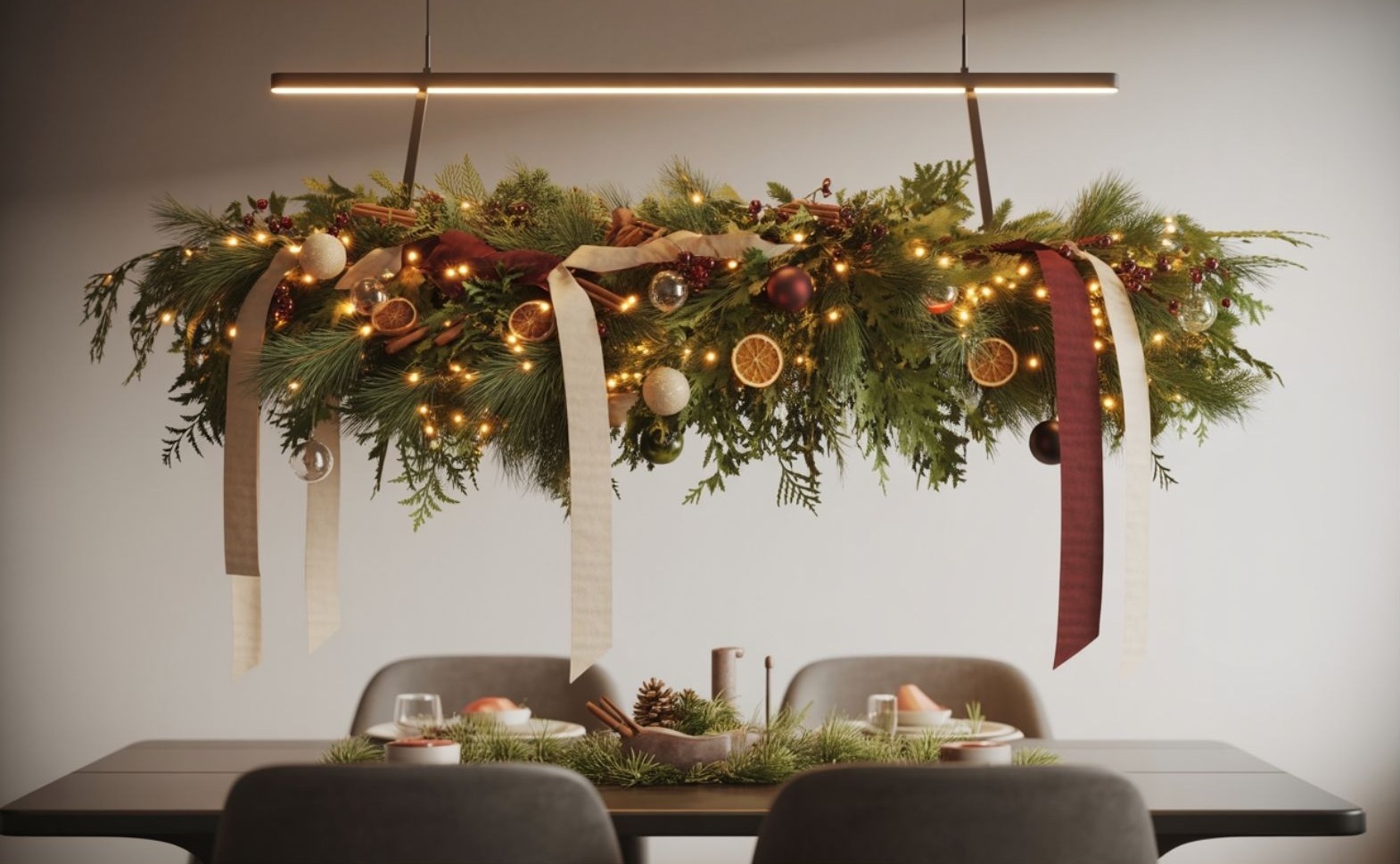 A rétegezés a titok: a természetes lomb adja az alapot, a fények teremtik meg a hangulatot, a díszek pedig karaktert visznek a kompozícióba. A végeredmény olyan, mintha egy ünnepi installáció lebegne az asztal fölött – látványos, mégis könnyed.
