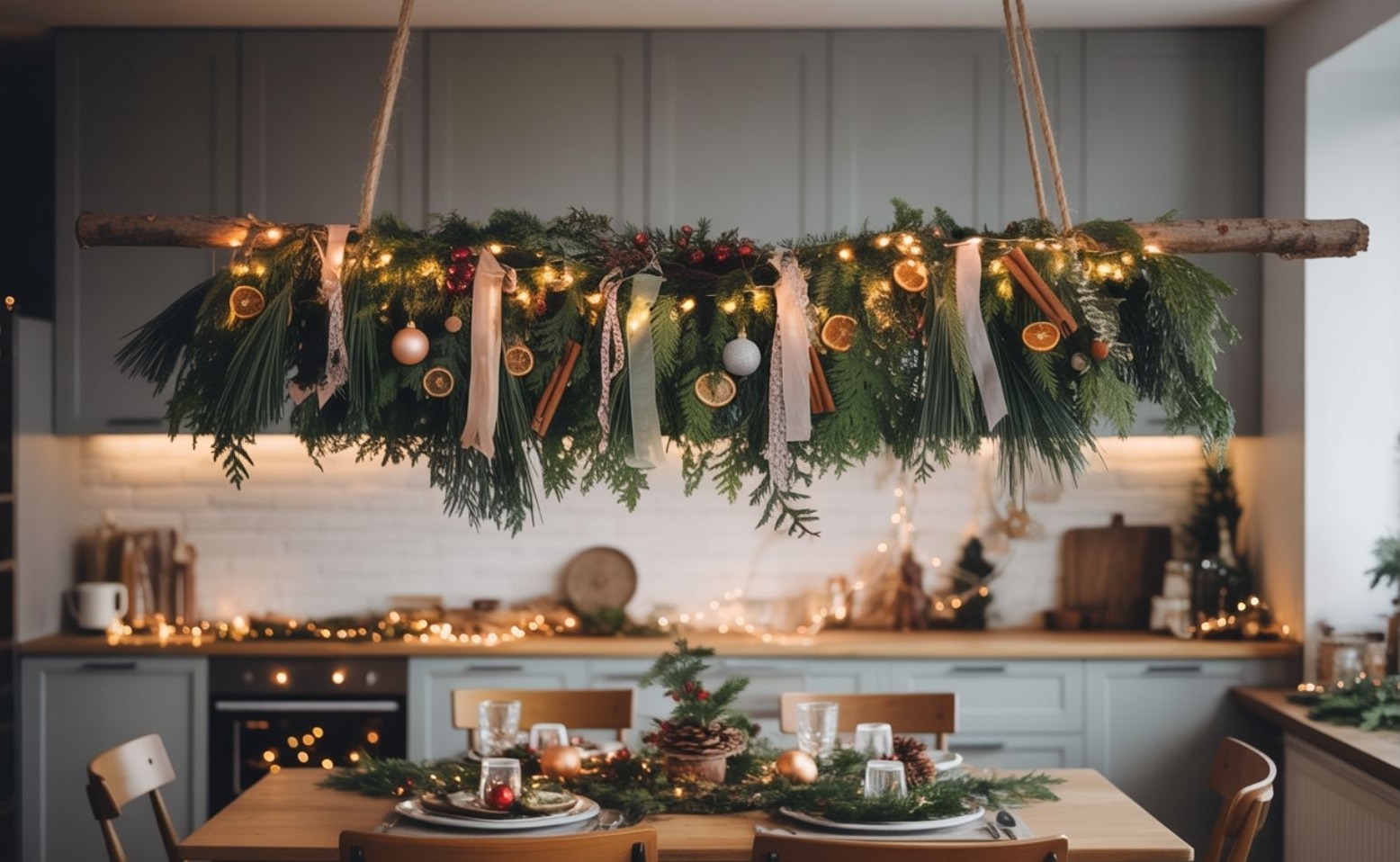 Ha nem szeretnél külön állványt, akkor is van B-terv. A mennyezeti lámpatest vagy csillár remek alap: óvatosan, hőálló távolságban rögzíthetsz rá fenyőágakat, fényfüzéreket vagy szalagokat. Ha rusztikus hangulatot szeretnél, akassz fel egy erősebb, természetes ágat erős zsinórral – ez ma az egyik legnépszerűbb skandináv dekorötlet.