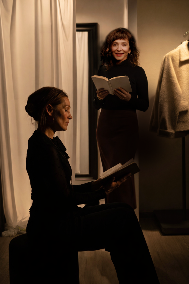 Az estnek az Emporium Oktogonon található üzlete adott teret, az elkötelezett vásárlókból álló közönség számára ismerős helyszín pedig csak még bensőségesebbé tette a hangulatot. A hét novellát Enyedi Éva és Fodor Annamária, a Pintér Béla Társulat színésznői keltették életre, a felolvasószínházra jellemző letisztult formában, így lehetővé téve, hogy a hangsúly a szövegen maradjon, amelyet a színészi jelenlét és az öltözékek finoman kísértek.