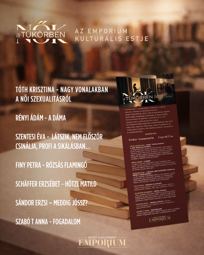 Ez az érzelmileg telített tér és a kultúra iránti mély elköteleződés hívta életre az Emporium rendhagyó felolvasószínházi eseményét Nők a tükörben címmel. A magyar márka számára a kultúra nem pusztán kísérőelem, hanem alapérték. „Számomra a kultúra jóval túlmutat a klasszikus értelemben vett kulturális eseményeken – mondja Ildikó. – Áthatja az élet minden területét: az étkezést, a lakberendezést, az öltözködést. Egy belülről jövő jó érzést ad, ami kiteljesít. Ezért is rendezzük meg már 10. éve a Kultúra Hónapját, amikor február 22-ig a vásárlóink által bemutatott színház- és koncertjegyük értékét levonjuk a vásárlásuk összegéből.” Janka számára a kultúra kapaszkodó is egyben: „Egy olyan erő, ami tartást ad és rendet teremt ebben a kusza világban. Akik kultúrát közvetítenek, szerintem kicsit megmentik a világot.”