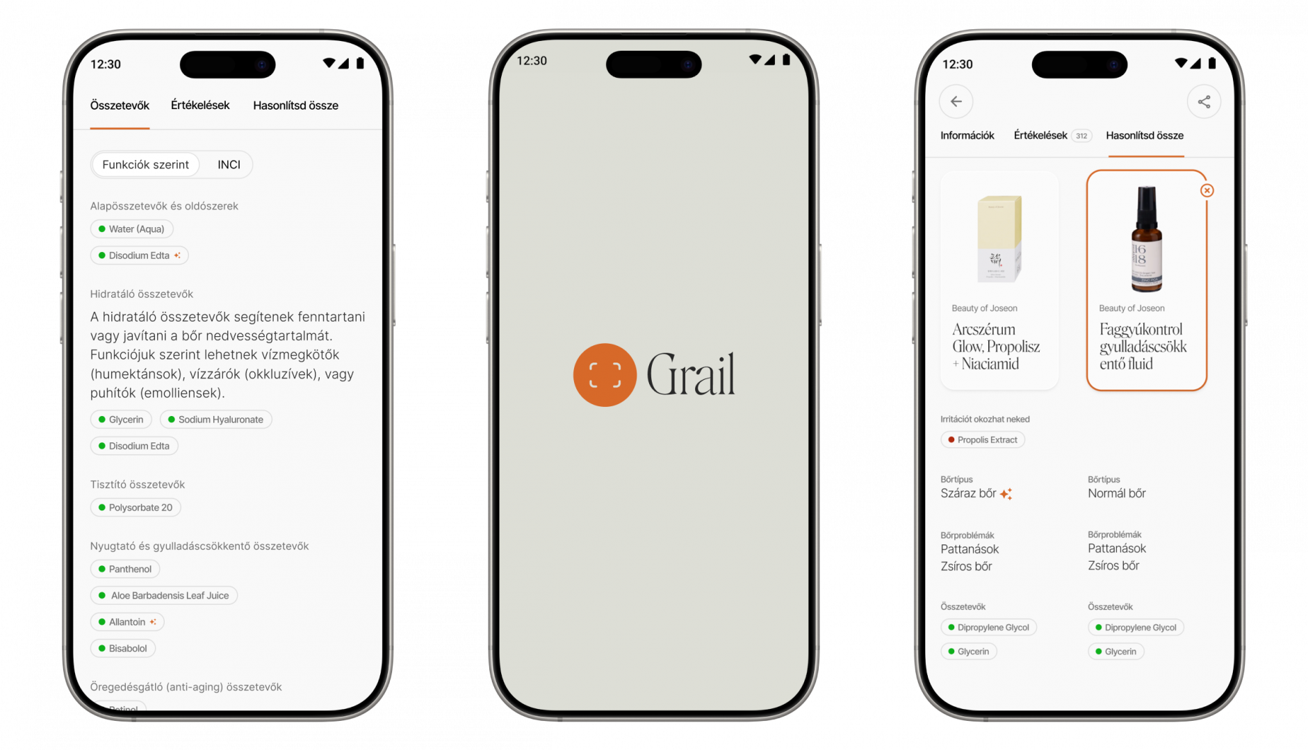 A legjobb rutin az, amit értesz. Ebben segít a Grail, egy magyar fejlesztésű app, amely vonalkód-beolvasással felismeri a termékeket, és egyszerűen elmagyarázza, mit tartalmaznak, hogyan hatnak, és kinek valók. Az alkalmazásban beállíthatod a bőrtípusodat, érzékenységedet, és akár össze is hasonlíthatod a kiszemelt készítményeket. Fontos, a Grail nem mondja meg, mit vegyél, de megmutatja, mit érdemes tudnod az adott termékről, mielőtt kiválasztod.